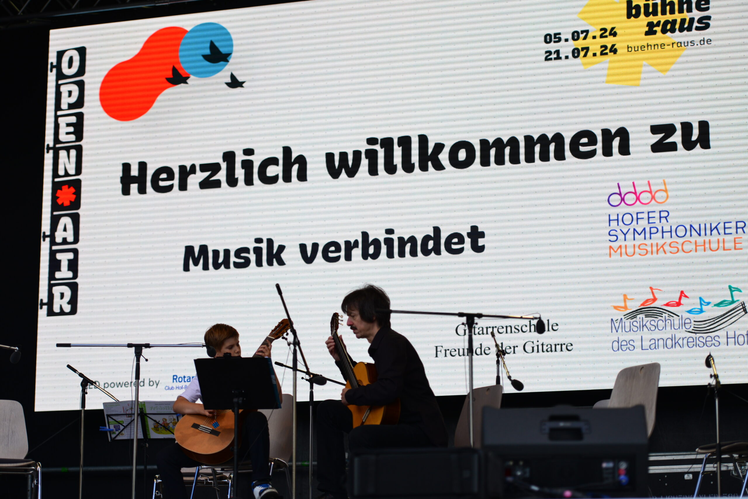 Am 13.07. präsentierten sich bei „Bühne raus 2024“ im Rahmen eines Gemeinschaftkonzertes der Musikschule des Landkreises Hof, der Mukschule der Hofer Symphoniker und der Gitarrenschule „Freunde der Gitarre“ von 11.30 – 12.30 Schülerinnen und Schüler der Gitarrenklassen von Jens Gottlöber und Miloslav Matousek und der Klavierklassen von Tamara Ilisinska-Gromek und Jaroslaw Gromek.